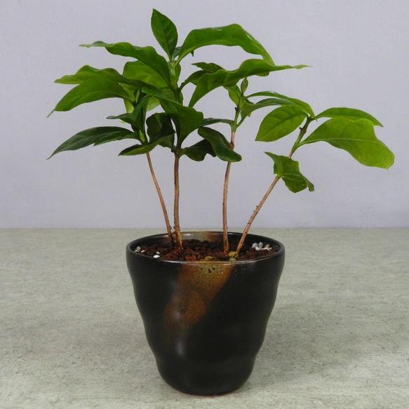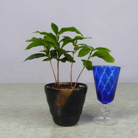 人気観葉植物「コーヒーノキ」の陶器小鉢となります。